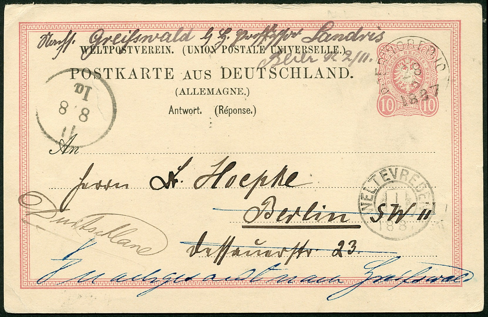 DUITSLAND. Antwoordbk. van 10pf van Poerworedjo 28-6-1887 over Tegal 30-6 en 31-6 (az.) via Weltevreden 1-7 naar Berlijn 8-8