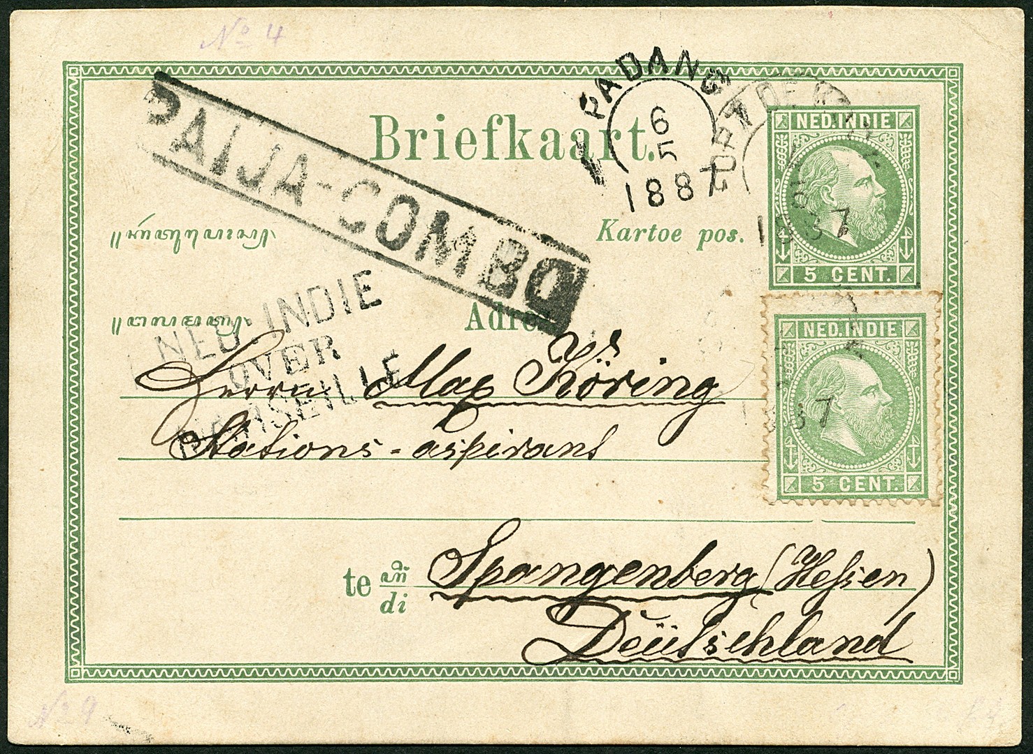 DUITSLAND. Bk. G6 bijgefr. met 5c nr. 8G van Paija-Combo (naamstempel) via Fort de Kock 4-5-1887 en Padang 6-5 over Marseille (routest.) naar Spangenberg (Hessen)