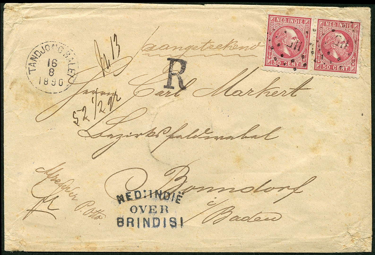 DUITSLAND. 50 Cent nr. 15H in vrijwel prachtpaar (rechtsboven mist hoekje) op env. van 52½ gram aangetekend van Tandjongbalei 16-8-1890 (nummerstempel 115) via Laboean Deli 17-8 en de Ned.Ind. Penang 19-8 over Brindisi (routest.) naar Bonndorf (Baden) 16-9. Zeldzaam tarief (25c per 15 gram, zegel van 10c voor R-recht verwijderd)