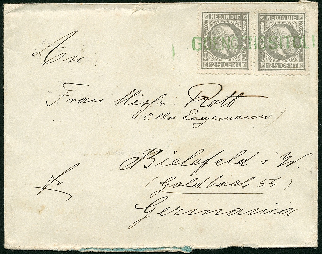 DUITSLAND. 12½ Cent nr. 10H (2x) op env. (az. wat ruw geopend en hersteld) in groen afgest. met naamstempel Goenoegsitoli (op eiland Nias) via Padang naar Bielefeld 6-7-1900