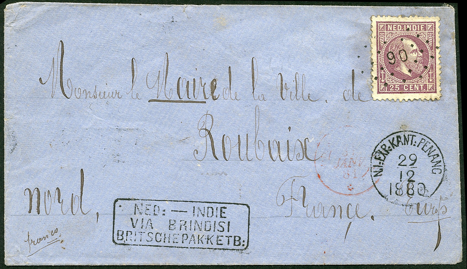 FRANKRIJK. 25 Cent nr. 13F op env. verz. van de N.I:Exp.Kant:Penang 29-12-1880 (superbe afdrukken rondtempel en nummerstempel 90) via Brindisi (routest.) per Frans spoorwegtraject 31-1-1881 en Lyon naar Roubaix