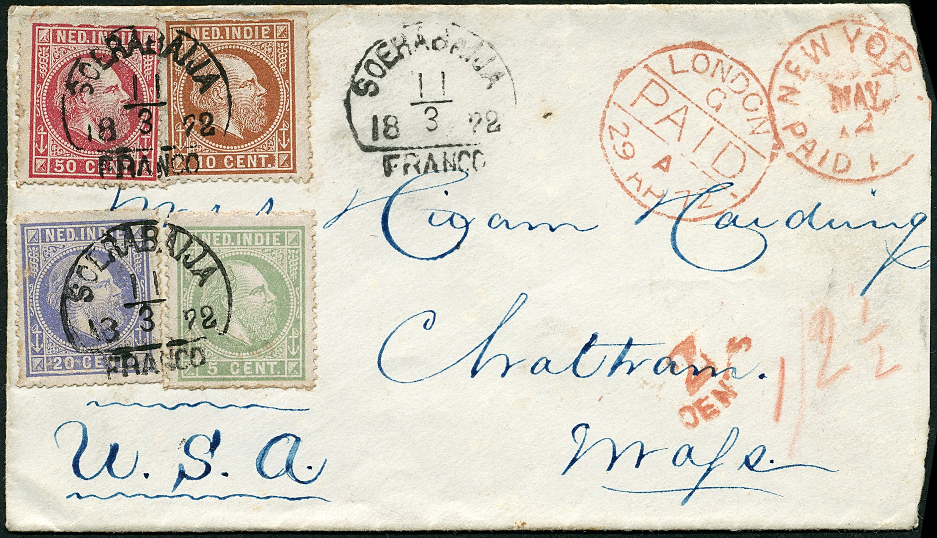 AMERIKA. USA. 5 Cent nr. 8A, 10c nr. 9A, 20c nr. 12A en 50c nr. 15A op couvert van Soerabaija 11-3-1872 over Londen 29-4 en New York naar Chatham, Massachusetts. Het tarief voor enkelvoudig gewicht naar de USA bedroeg toen 85 cent (az. in blauw potlood geschreven). Op de vz. geschreven '12½' (gewicht?) en een rood stempel '2 cents'. De brief is geadresseerd aan Mr Hiram Harding. Vandaag bestaat nog steeds een oud logement Captain's House Inn, waarvan de kamers zijn genoemd naar de vrouw, dochters en schepen van de kapitein Hiram Harding, de oorspronkelijke eigenaar van het etablissement. De zegels van 10 en 50 cent hebben een wat rafelige boventanding, overigens een zeer frisse prachtbrief en unieke vierkleurenfrankering. Tentoonstellingsstuk van grote, internationale allure