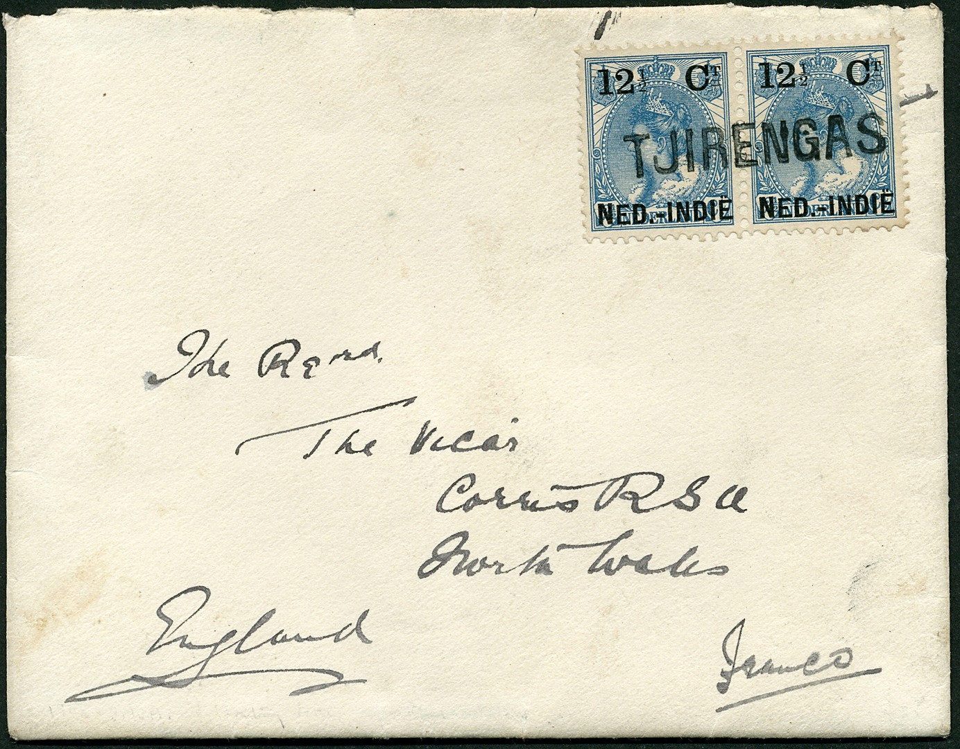 GROOT-BRITTANNIË. 12½ Cent nr. 32 in prachtpaar luxe afgest. met naamstempel Tjirengas op couvertje (klep ontbreekt) met inhoud, gedateerd 12-10-1905, naar Corris in Noord-Wales