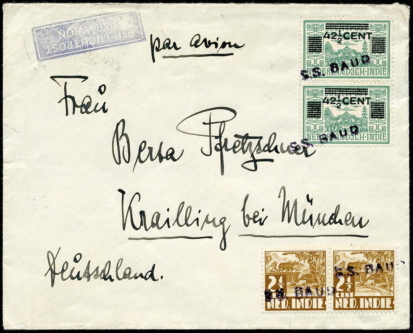 Env. ca. 1935 gefr. met 2½c in paar en 42½c in paar 4x afgest. met KPM-naamstempel 'S.S. BAUD' per luchtpost naar Duitsland