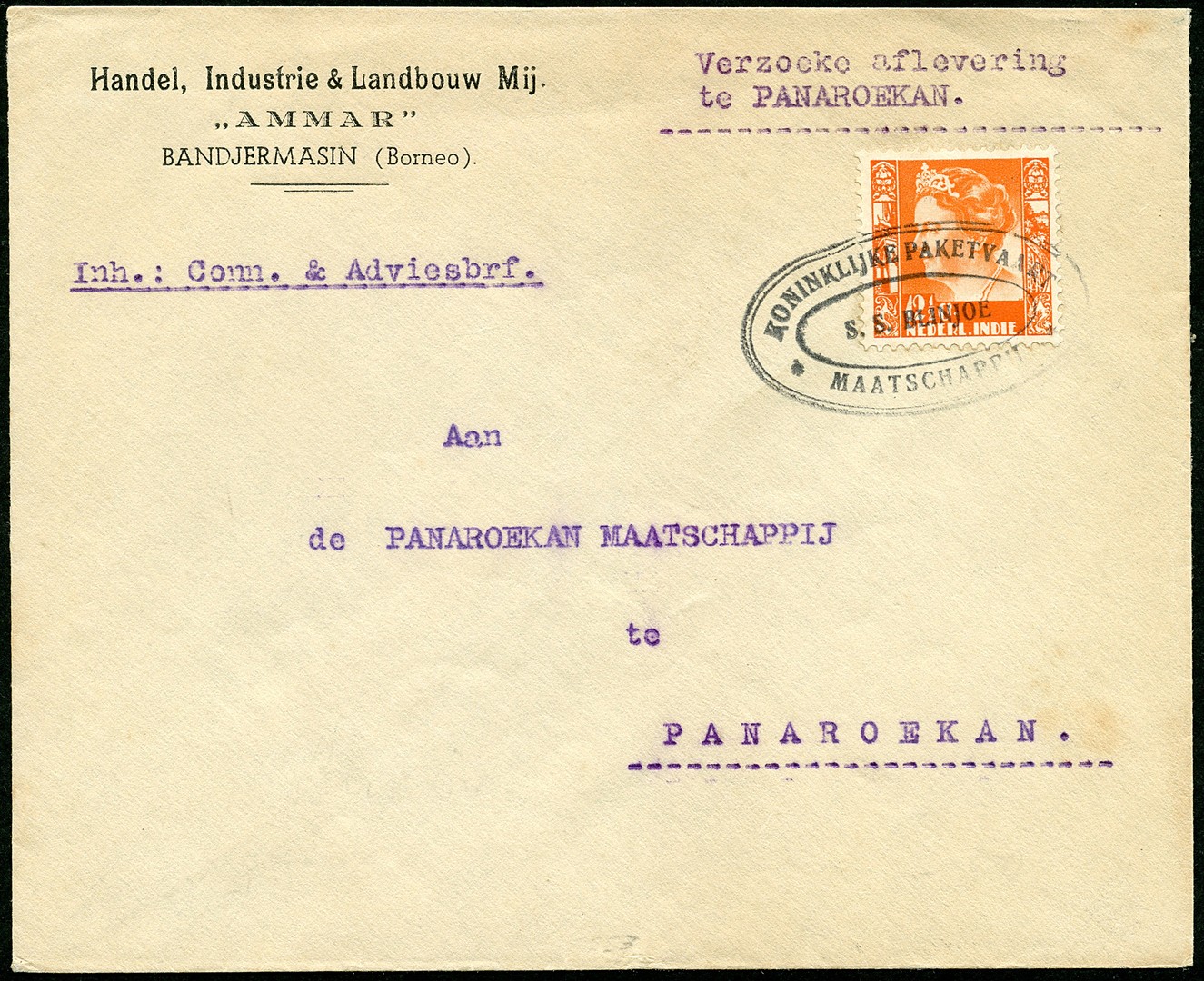 Firmacouvert uit Bandjermasin gefr. met 12½c afgest. KPM-ovaalstempel 'S.S. BLINJOE' naar Panaroekan (ca. 1935)