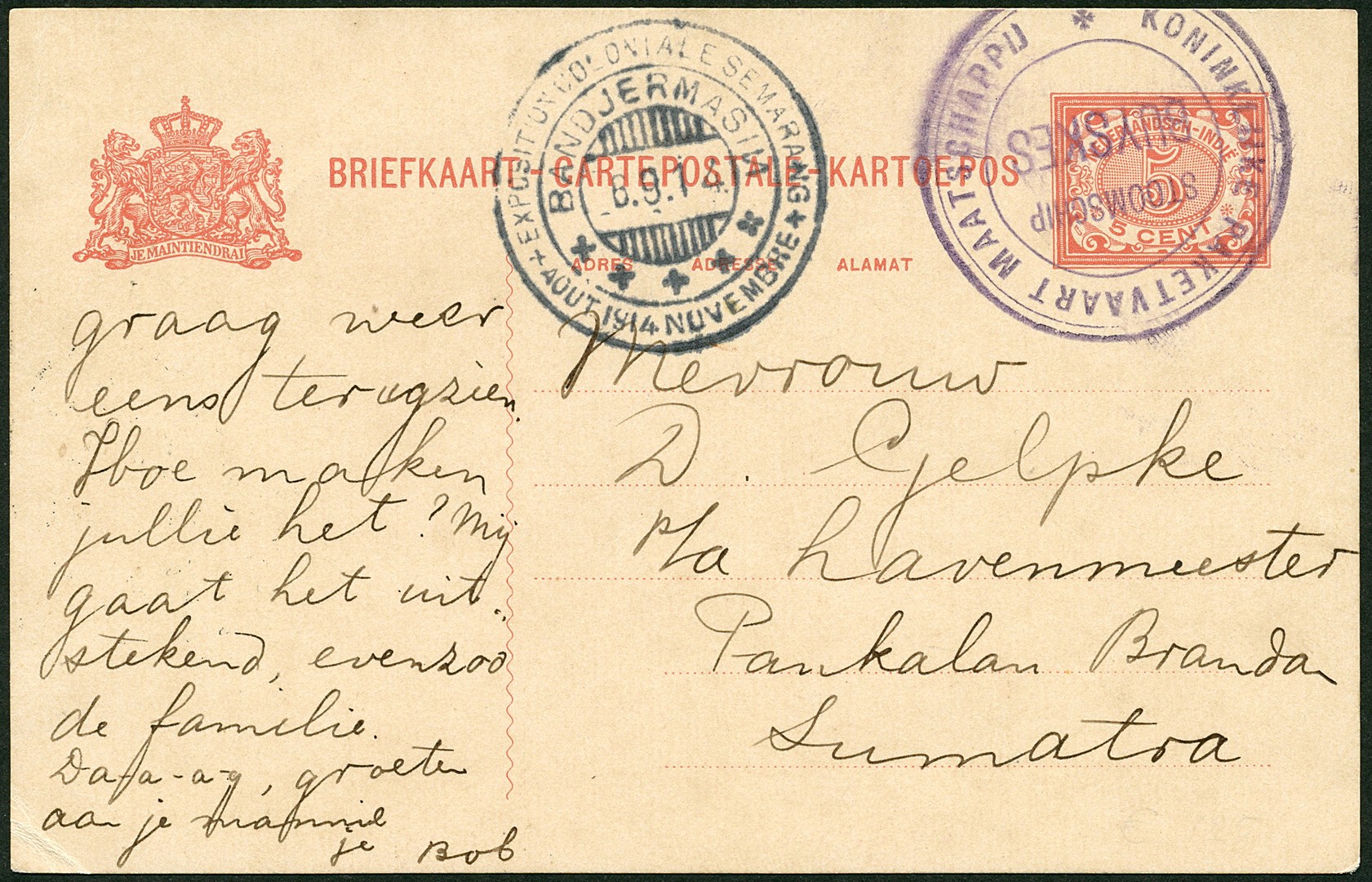 Bk. van 5c uit Stagen afgest. met KPM-rondstempel 'STOOMSCHIP BUYSKES' via Bandjermasin 6-9-1914 (de 2e N staat in spiegelbeeld) naar Pangkalanbrandan