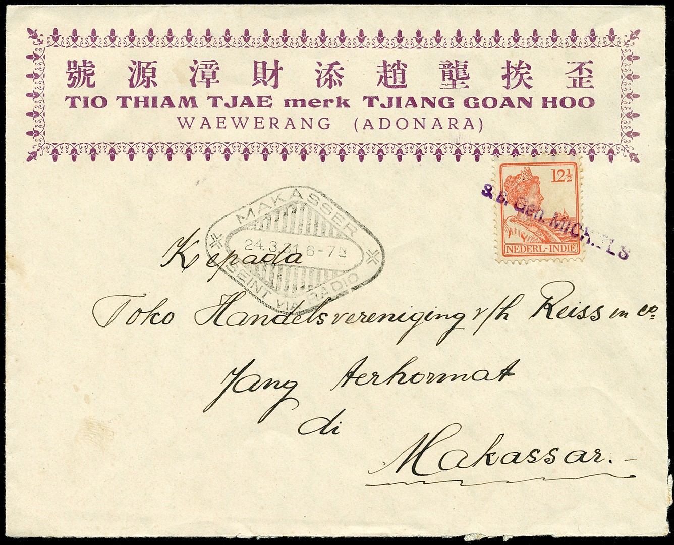 Firmacouvert uit Waewerang (Adonara, ten oosten van Flores) gefr. met 12½c afgest. met KPM-naamstempel 's.s. Gen. MICHIELS' naar Makasser 24-3-1931. Zeldzame herkomst!