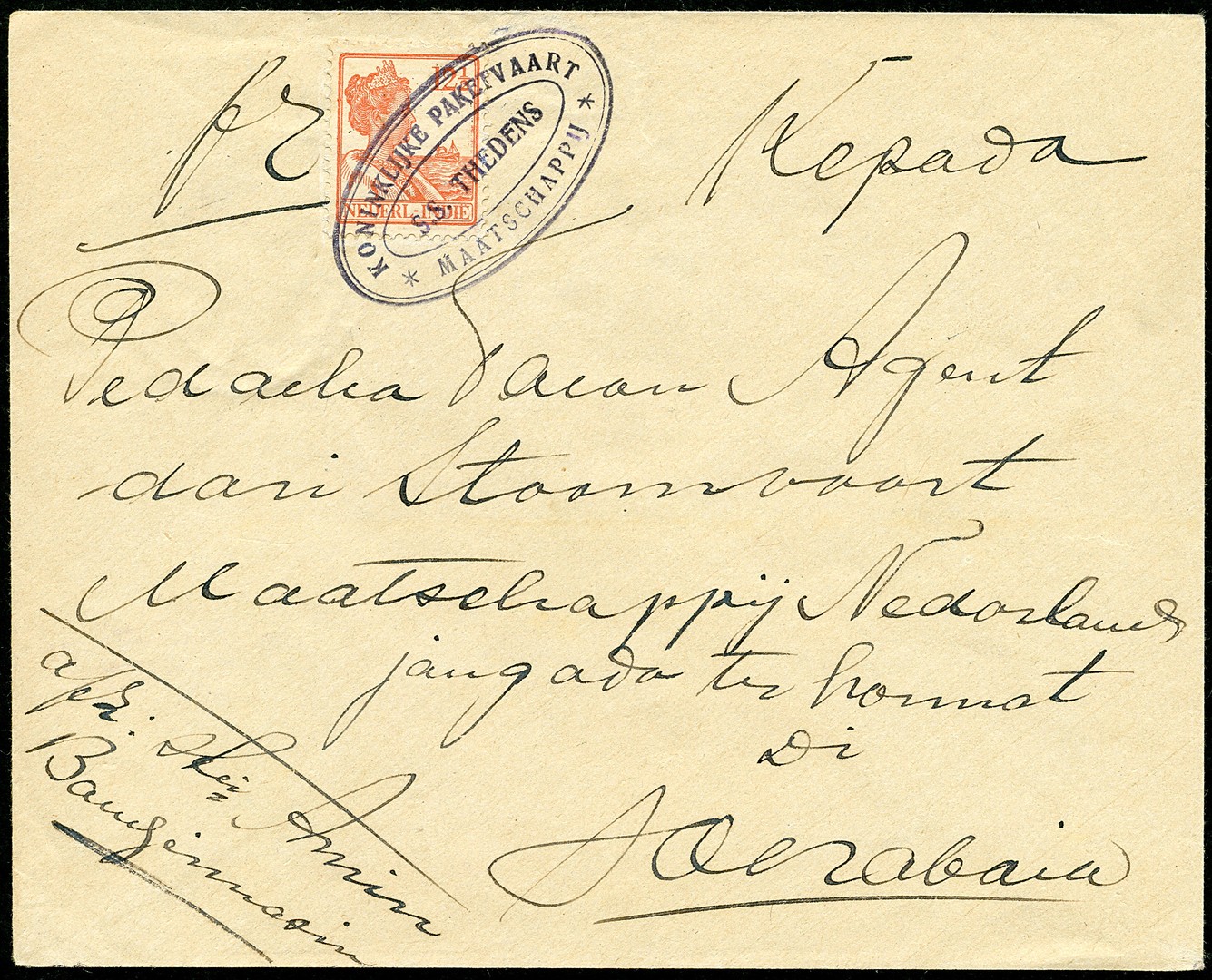 Env. uit Bandjermasin gefr. met 12½c afgest. met KPM-ovaalstempel 'S.S. THEDENS' naar Soerabaja 1-11-1928