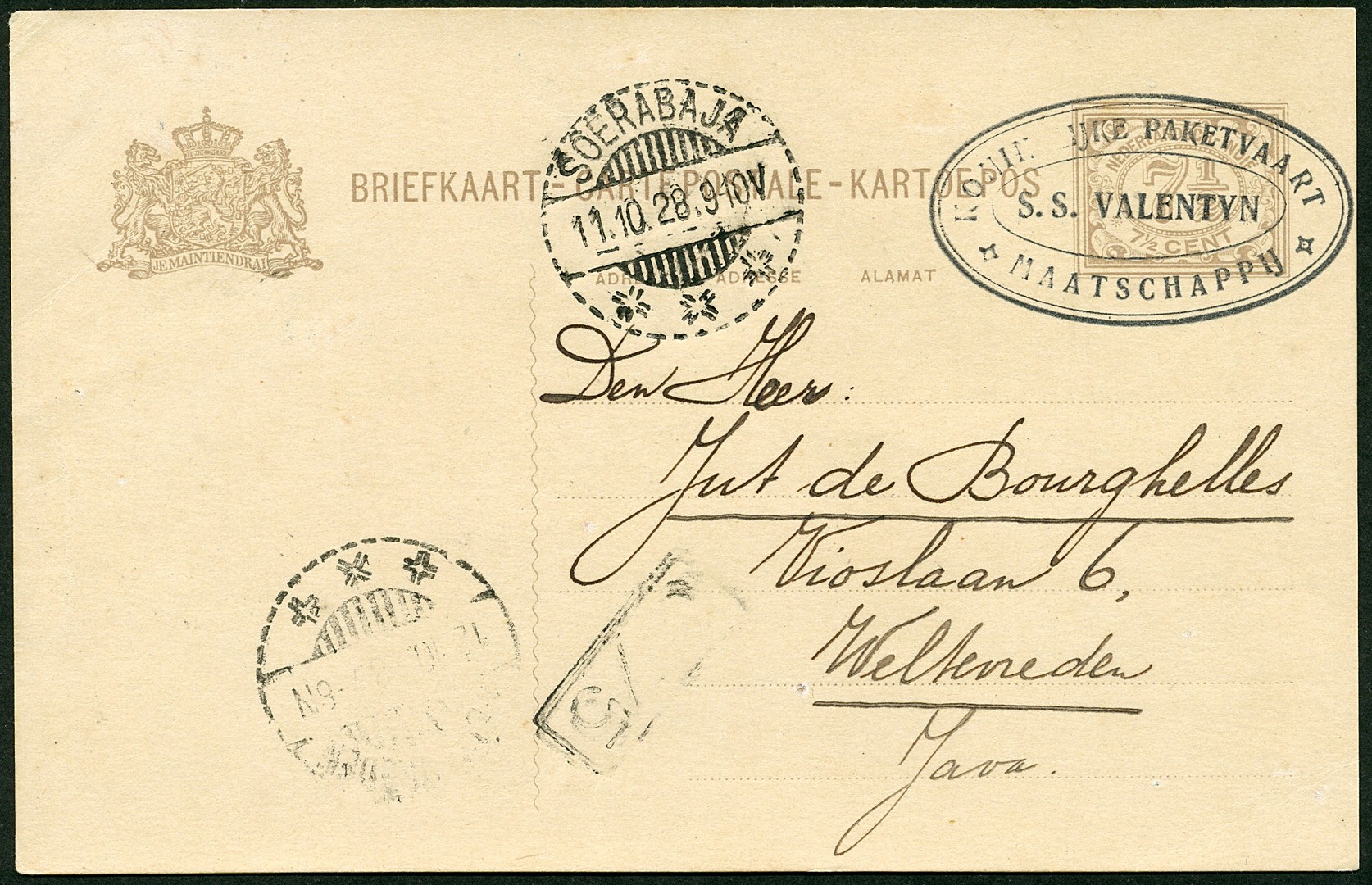 Bk. van 7½c prachtig afgest. met KPM-ovaalstempel 'S.S. VALENTYN' via Soerabaja 11-10-1928 naar Weltevreden 12-10