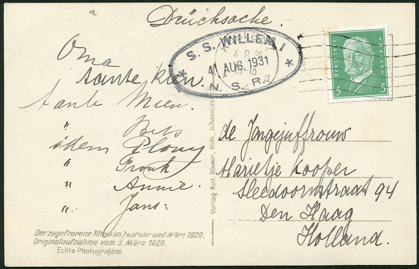 Nederlandse scheepspost. Rijnreis. Prentbk. op 4-8-1931 gepost aan boord van de S.S. WILLEM I van de Nederlandsche Stoomboot Reederij (N.S.R.), via Koblenz naar Den Haag, waarop een ovaalstempel van een type dat door ons nog niet eerder is gezien