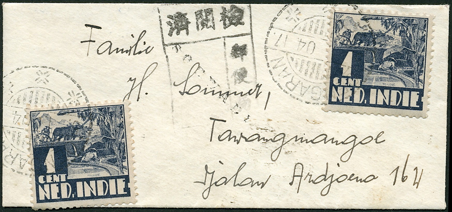 1 Cent Kreisler no. 15a 2x on small open envelope for printed matter from Oengaran 3.1.04 to Tawangmangoe, showing censor Bu.JC36 with straight-line name cancel of the censor Soewadi, which we have not seen before