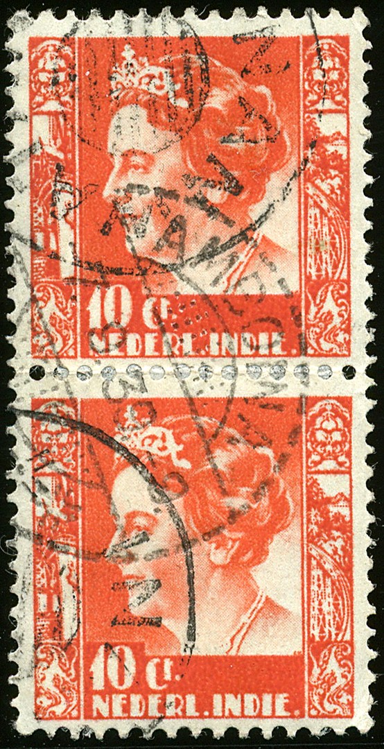 Bestelhuisstempel INANWATAN op 10c Kreisler. Prachtpaar tevens afgest. met Amboina 7.9.39.-9 (type PV2). Bijgesloten een bk. uit 1963 met interessante tekst over Inanwatan van Bender aan Bunge