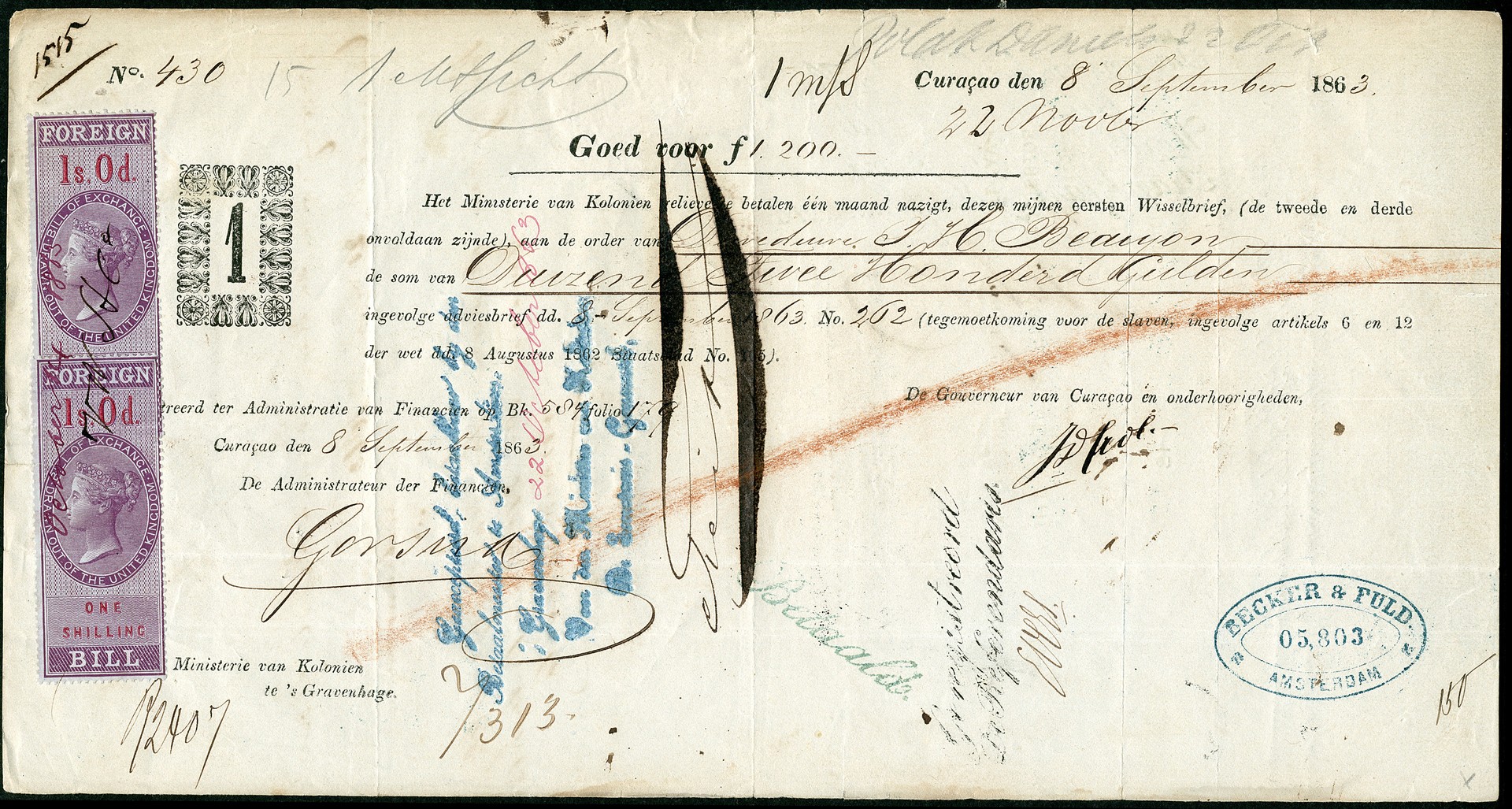Vijf wisselbrieven voor het vergoeden van vrijgelaten slaven, uitgeschreven op 18-8-1863 (2x), 8-9-1863 (2x) en 8-10-1863, ondertekend door de gouverneur van Curaçao J.D. Crol. Twee wisselbrieven zijn eveneens voorzien van Engelse fiscaalzegels van 2x 1 shilling (ex. van 8-9-1863) resp. 1x 4 shilling (ex. van 8-10-1863). Bijzonder mooi bewaard gebleven historische documenten w.o. uitermate zeldzame exemplaren!