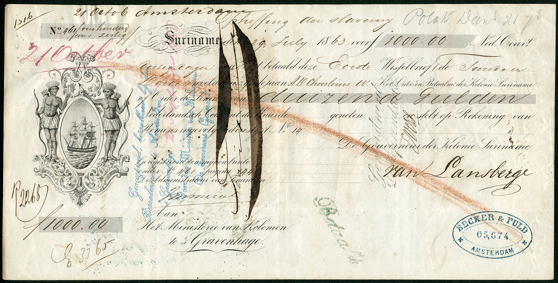 Wisselbrief voor het vergoeden van een vrijgelaten slaaf. De slavernij werd op 1 juli 1863 in Suriname afgeschaft en de slavenhouder werd daarvoor financieel schadeloos gesteld door de Nederlandse Staat. Deze wisselbrief nr. 461 is uitgeschreven op 29-7-1863, ondertekend door de Gouverneur der Kolonie Suriname R.F. van Lansberge, geldbedrag € 1000, uitgekeerd op 21-10-1863 aan toonder. Prachtig bewaard gebleven historisch document met notities, op de achterzijde een Brits fiscaalzegel van 1 shilling, een droogstempel van 50 cent, stempels, etc.