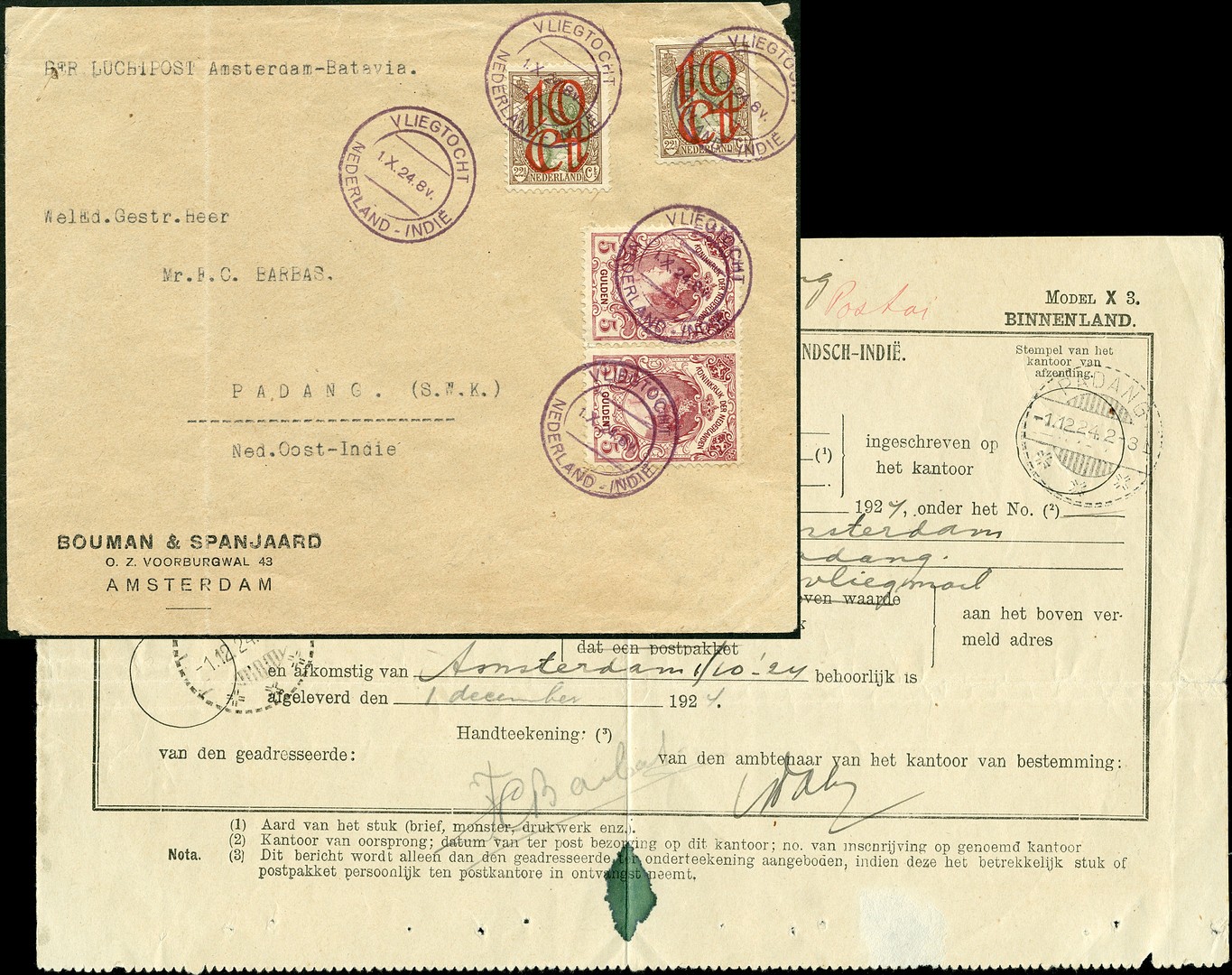 VAN DER HOOP-VLUCHT. Firmacouvert (vert. vouw) van Bouman & Spanjaard (alias Bospana, een exportzaak in optische artikelen, vulpennen, etc.) gefr. met 2x nrs. 79 en 120, 5x mooi gestempeld met 'Vliegtocht / Nederland - Indië' (type: zonder ster), via Weltevreden 24-11-1924 naar Padang 1-12. Mogelijk is de geadresseerde een zakenrelatie. Tevens bijgevoegd het erbij horende Indische PTT-formulier 'Bericht van Ontvangst', Model X 3. Naar ons idee geen overduidelijke verzamelaarspost! VH.B.3a-II. € 1400+