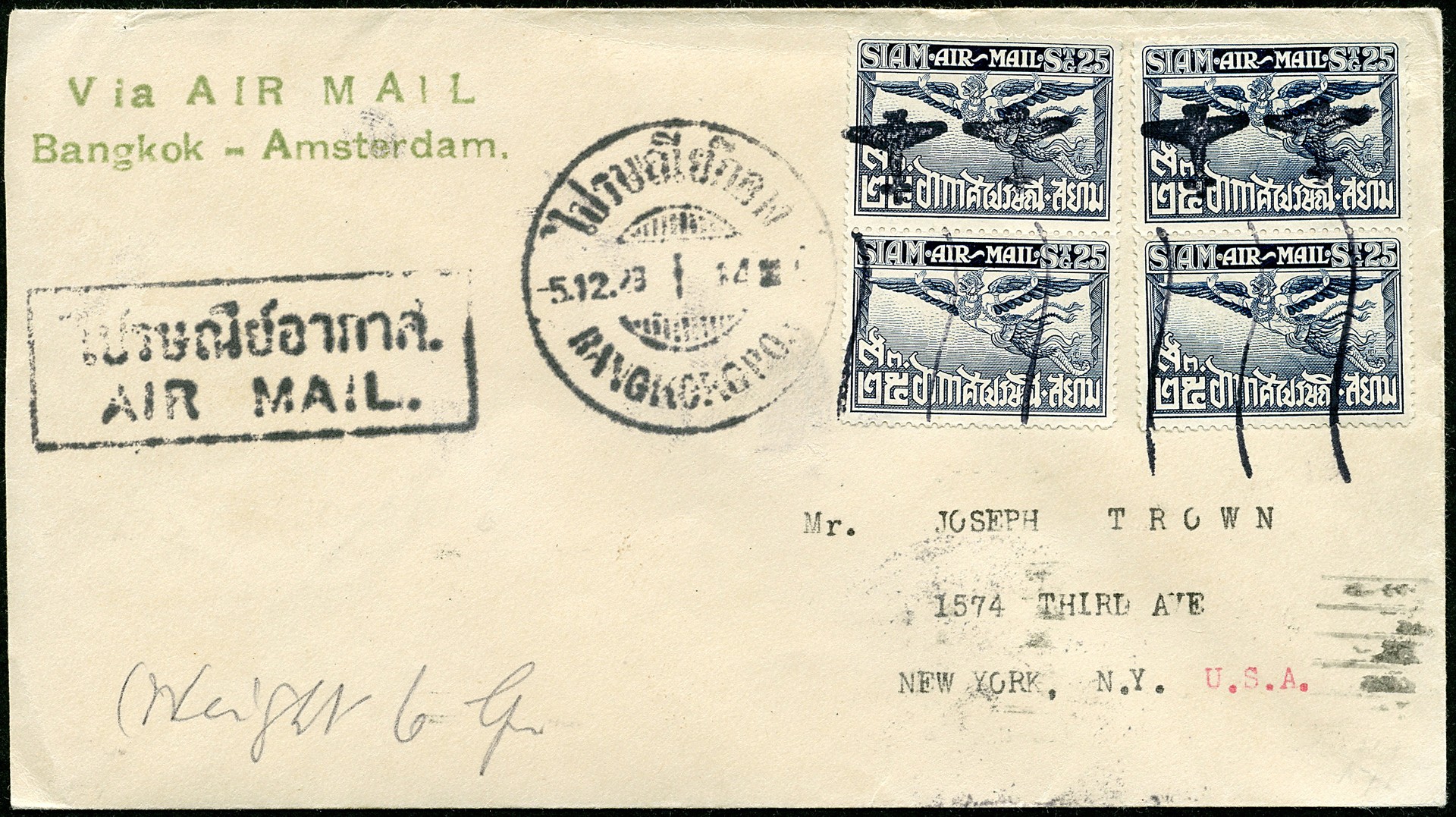 Bandoeng-Amsterdam 4-12-1929, 4e terugvlucht. Postinlading te Bangkok, op 5-12 naar New York 24-12. VH.B.35t (afgebeeld op blz. 343). € 175