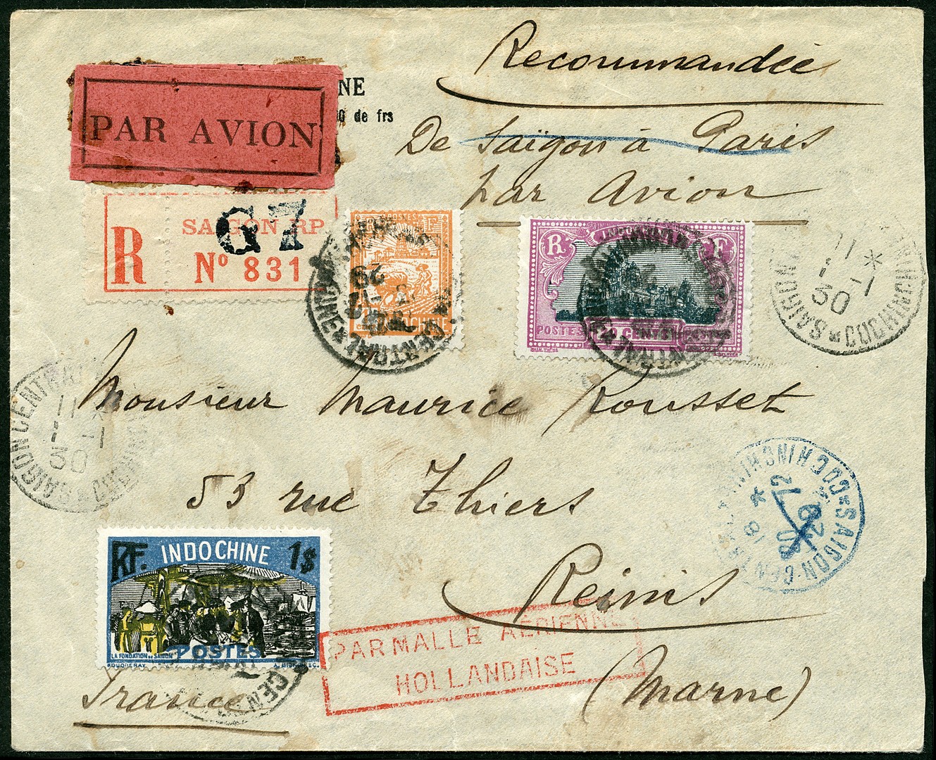 Bandoeng-Amsterdam 1-1-1930, 6e terugvlucht. Env. van Saigon 1-1-1930 (afst. in blauw met foute datum 20-12-1929 doorgehaald) naar Bangkok en verder naar Reims 13-1. VH.B.38b-I. € 115