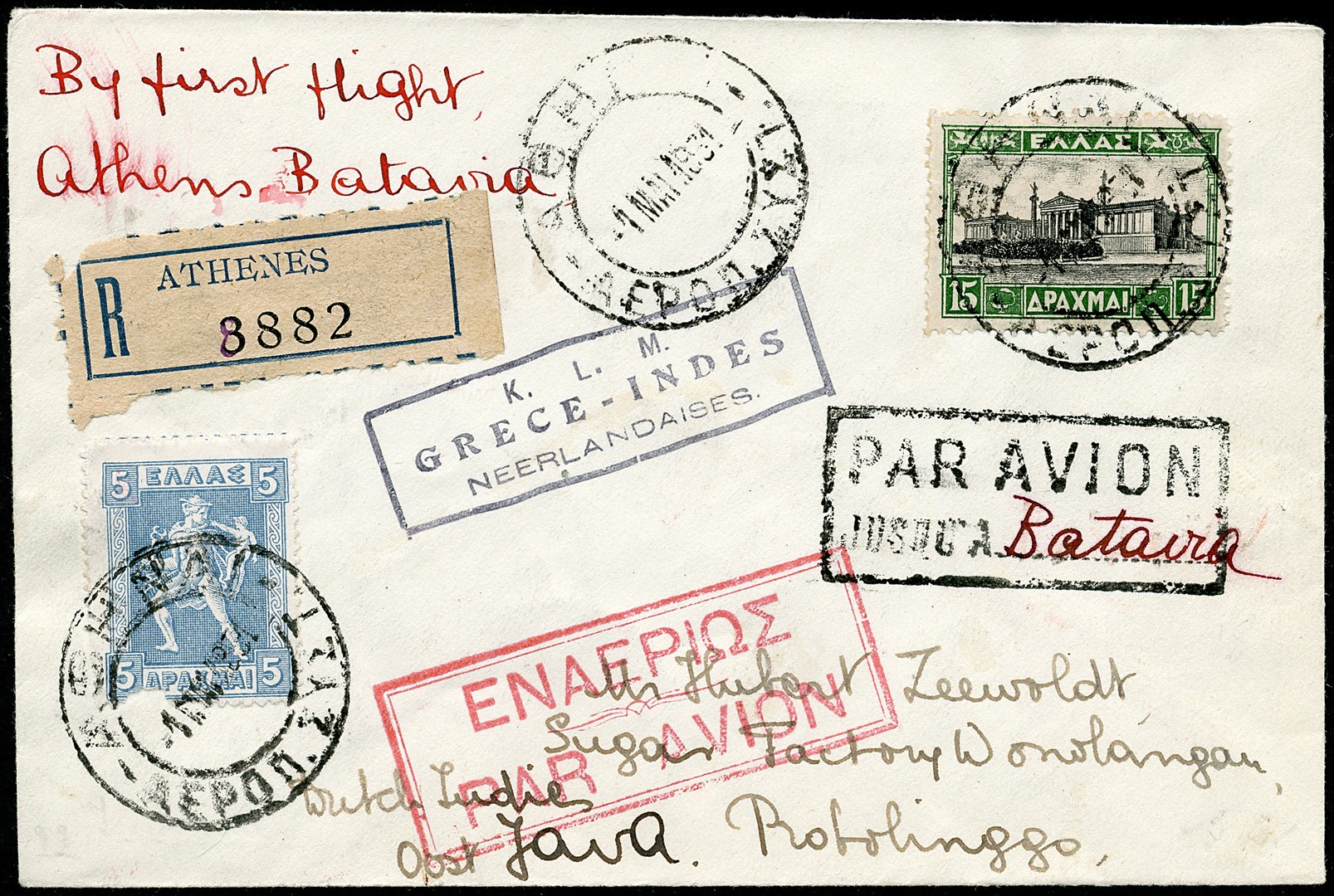 Amsterdam-Athene-Bandoeng 30-4-1931. Env. van Athene 1-5 via Batavia-/Centrum 9-5 naar Probolinggo 11-5. VH.B.58g (slechts 53 stuks gevlogen). € 175