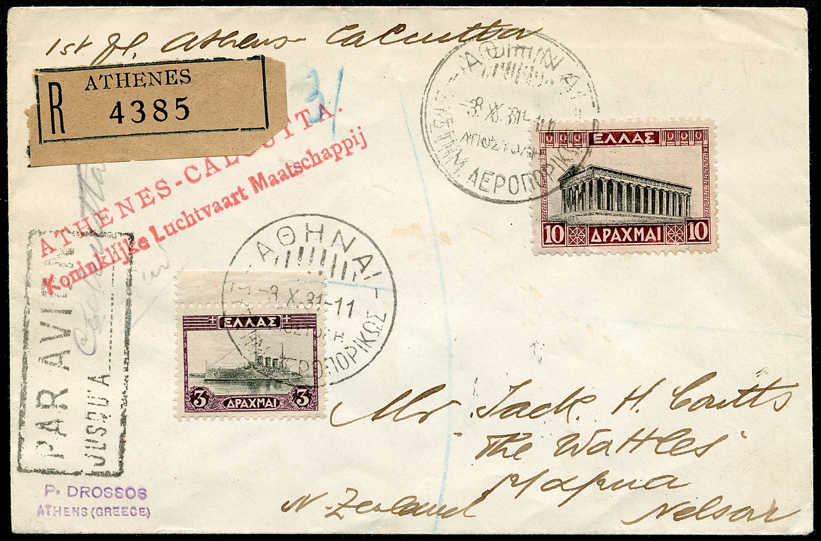 Amsterdam-Athene 1-10-1931, Athene-Calcutta-Bandoeng 4-10, 1e vlucht wekelijkse dienst. Env. van Athene 3-10 nar Calcutta 10-10 en verder naar Mapua, Nieuw-Zeeland. VH.B.60b (slechts 51 stukken gevlogen). € 175