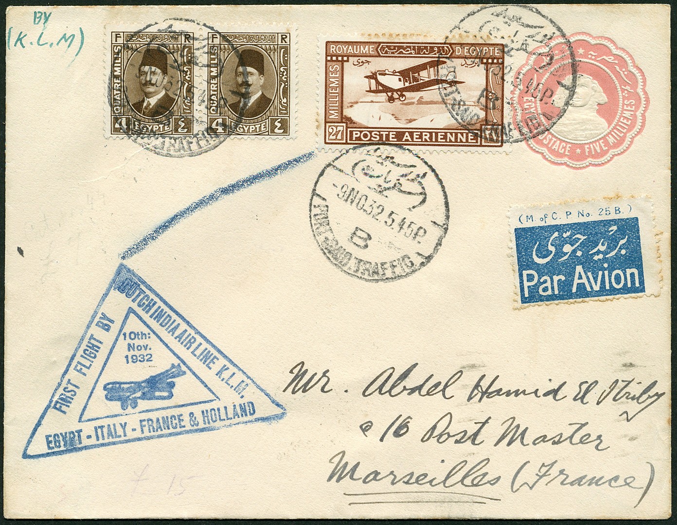 Bandoeng-Caïro 4-11-1932, Caïro-Rome-Amsterdam 10-11. Env. van Port Said 9-11 naar Marseille 12-11. VH.B.76b (slechts 25 poststukken gevlogen). € 200