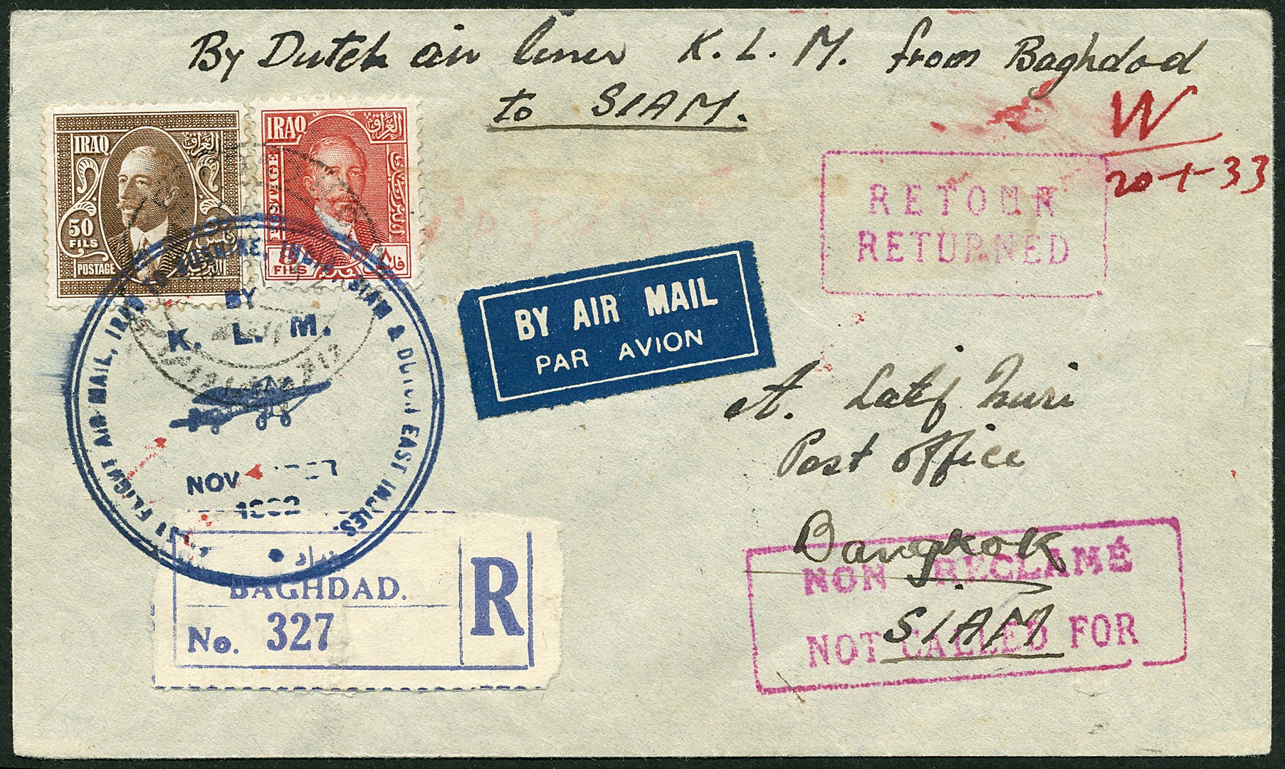 Amsterdam-Baghdad 17-11-1932, Baghdad-Bandoeng 22-11. Env. van Baghdad 20-11 met bestemming Bangkok, daar 'Non réclamé', met op az. een veelheid van stempels en notities. VH.B.78c (slechts 7 poststukken gevlogen!). € 250
