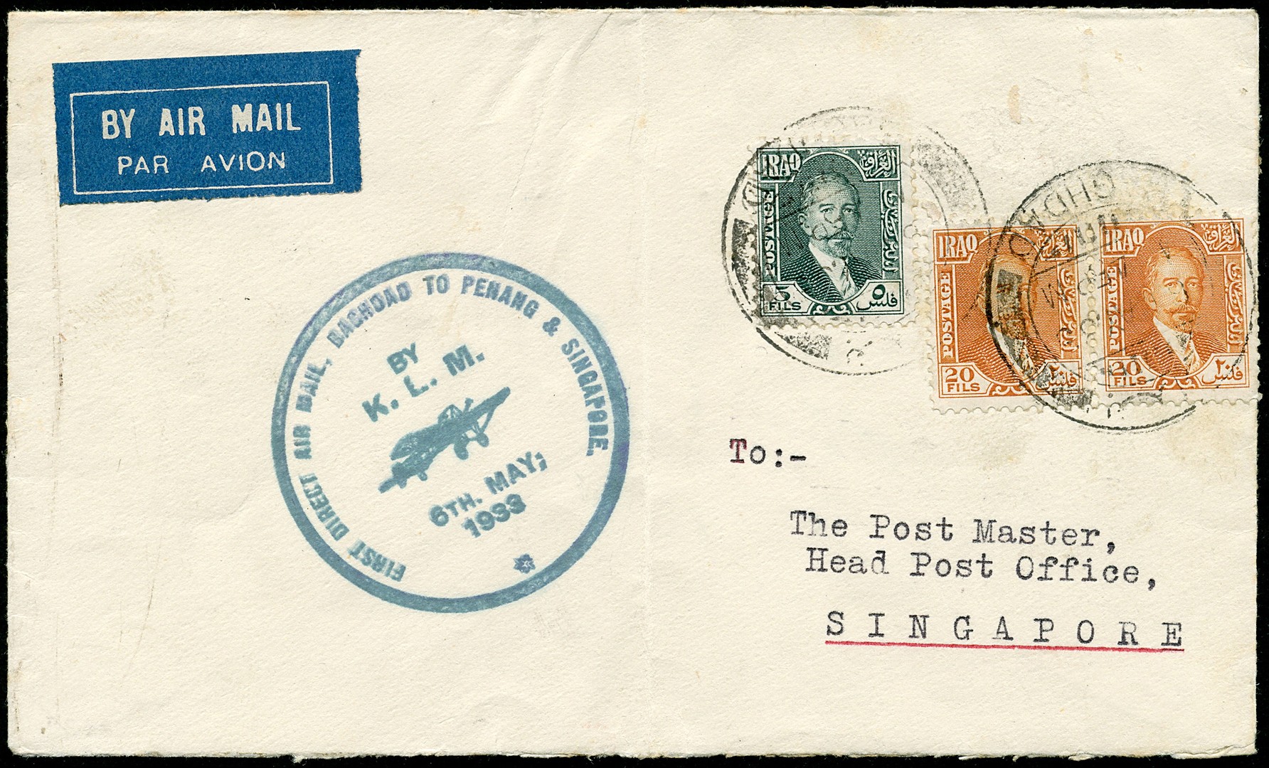 Amsterdam-Athene-Singapore-Alor Star-Bandoeng 4-5-1933. Env. (vert. vouw) van Baghdad 6-5 naar Singapore 12-5. VH.B.83f (slechts 41 stukken gevlogen). € 150