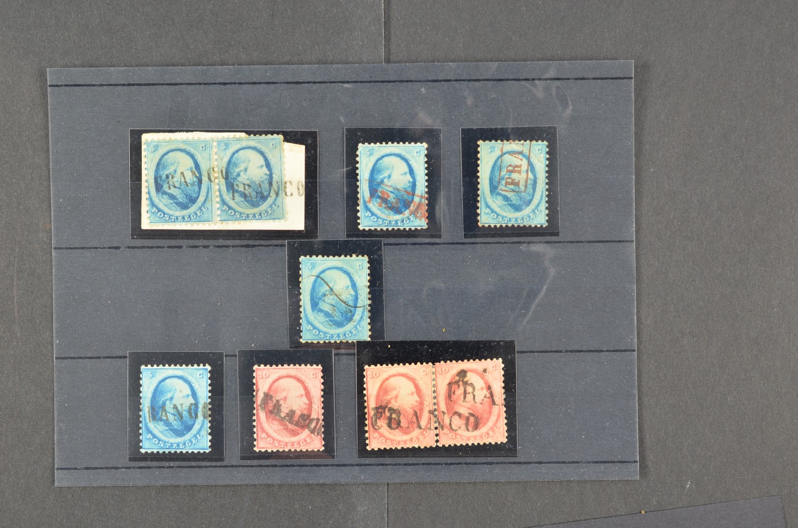 POSTHISTORIE. Emissie 1864, Franco zonder kader op 5 cent (3x) en 10 cent (3x), Franco in kader rood op 5 cent (2x) en 5 cent met penvernietiging