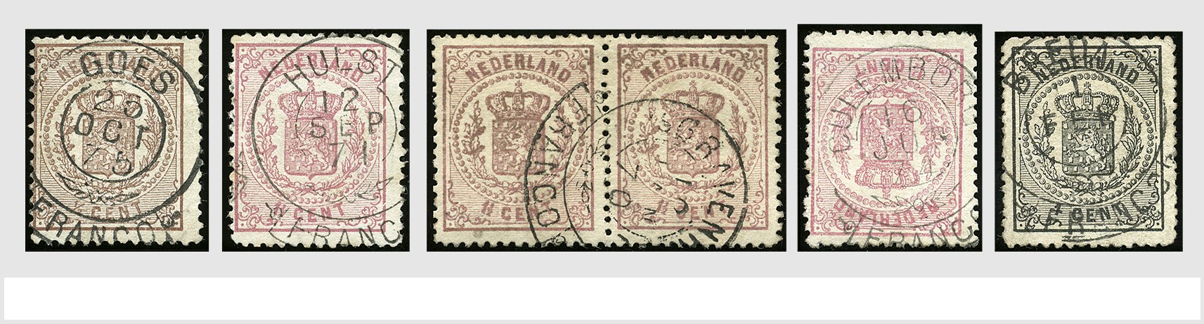POSTHISTORIE. Emissie 1869, diverse stempels als halfrond-franco, franco-takje, franco met of zonder kader, naam, etc. op 41 ex. waarbij alle waarden