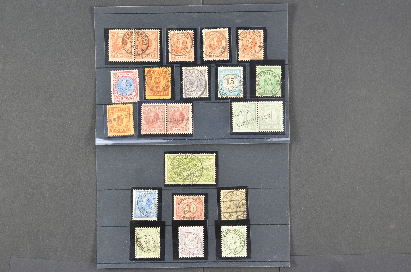 POSTHISTORIE. Diverse zegels en waarden emissies 1872-1906 (o.a. nr. 29) met verschillende stempels w.o. naam, kleinrond en buitenlandse op 2 insteekkaartjes