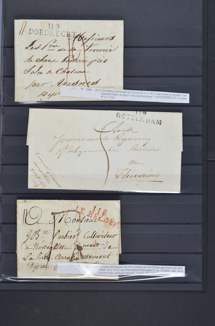 POSTHISTORIE. Departementsstempels 119/DORDRECHT (in zwart op vouwbrief 5-2-1813), 119/ROTTERDAM (in zwart, op omslag 7-12-1813) en 118/LE HELDER (in rood op liefdesbrief van een soldaat van het Franse garnizoen in Den Helder 10-3-1813)
