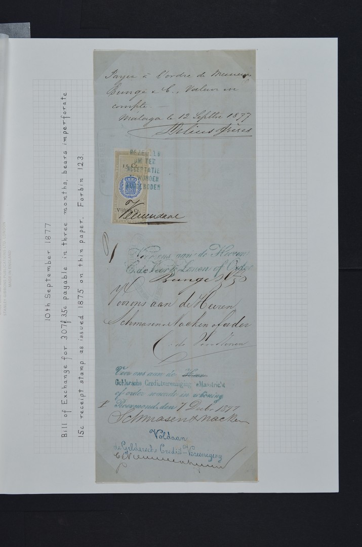 FISCAAL. 3 oude buitenlandse kwitanties 1877-78 in Nederland uitbetaald en elk voorzien van zegel van 15 cent, alsmede 8 fiscaalzegels 1884-1937 op bladen.