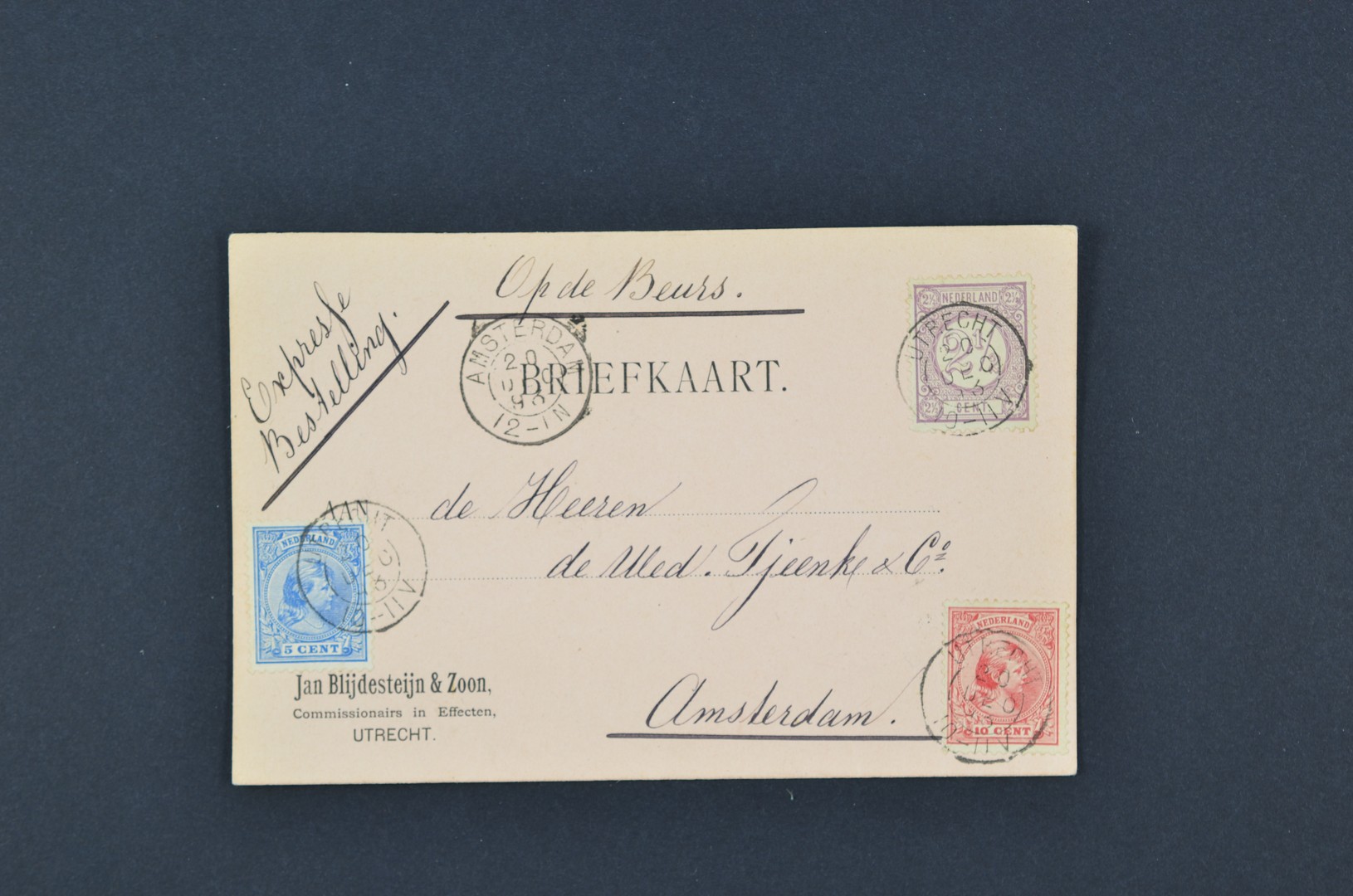 POSTHISTORIE. Mooie briefkaarten met expresse bestelling 'Op de Beurs' (1893), naar Algerije (1892, zeldzaam!) en naar Malang (1883)