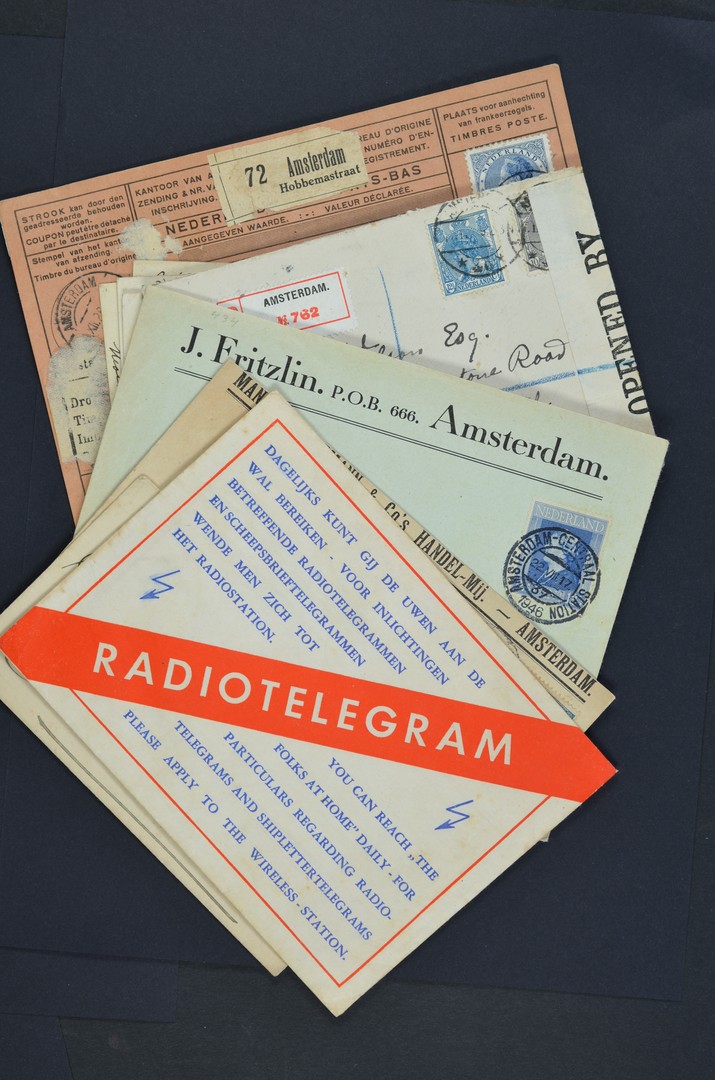POSTHISTORIE. Tien gevarieerde poststukken 1894-1948 w.o. adreskaart Veth (1926), 'per Book Post' (geprint) uit Londen (1894), radiotelegram met inhoud (1948), enkelfrankeringen, etc.