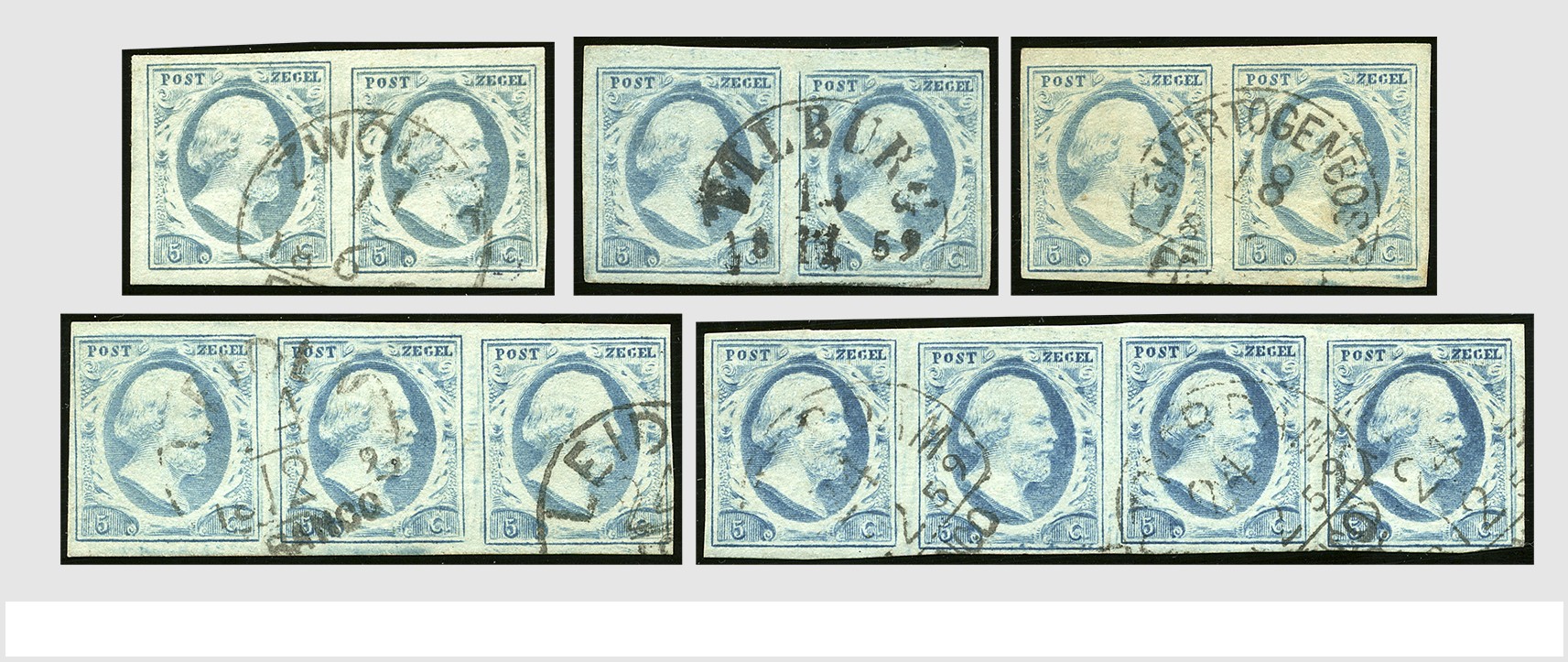 EMISSIE 1852. 5 Cent lichtblauw plaat III, 6x los, 14 paren, 1 strip van drie en 1 strip van vier, alle gepositioneerd en van goede kwaliteit