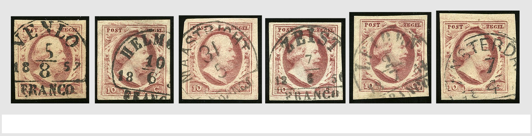 EMISSIE 1852. 10 Cent plaat III (7x), plaat IV (18x), plaat IX (4x), plaat X (9x), niet geplaat (9x), alle prachtex. w.o. randstukken