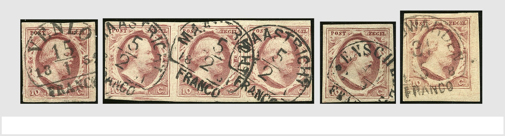EMISSIE 1852. 10 Cent plaat IV, 21x los, 3 paren en 1 strip van drie, merendeels gepositioneerd en alle prachtex. w.o. enkele rand- en hoekstukken