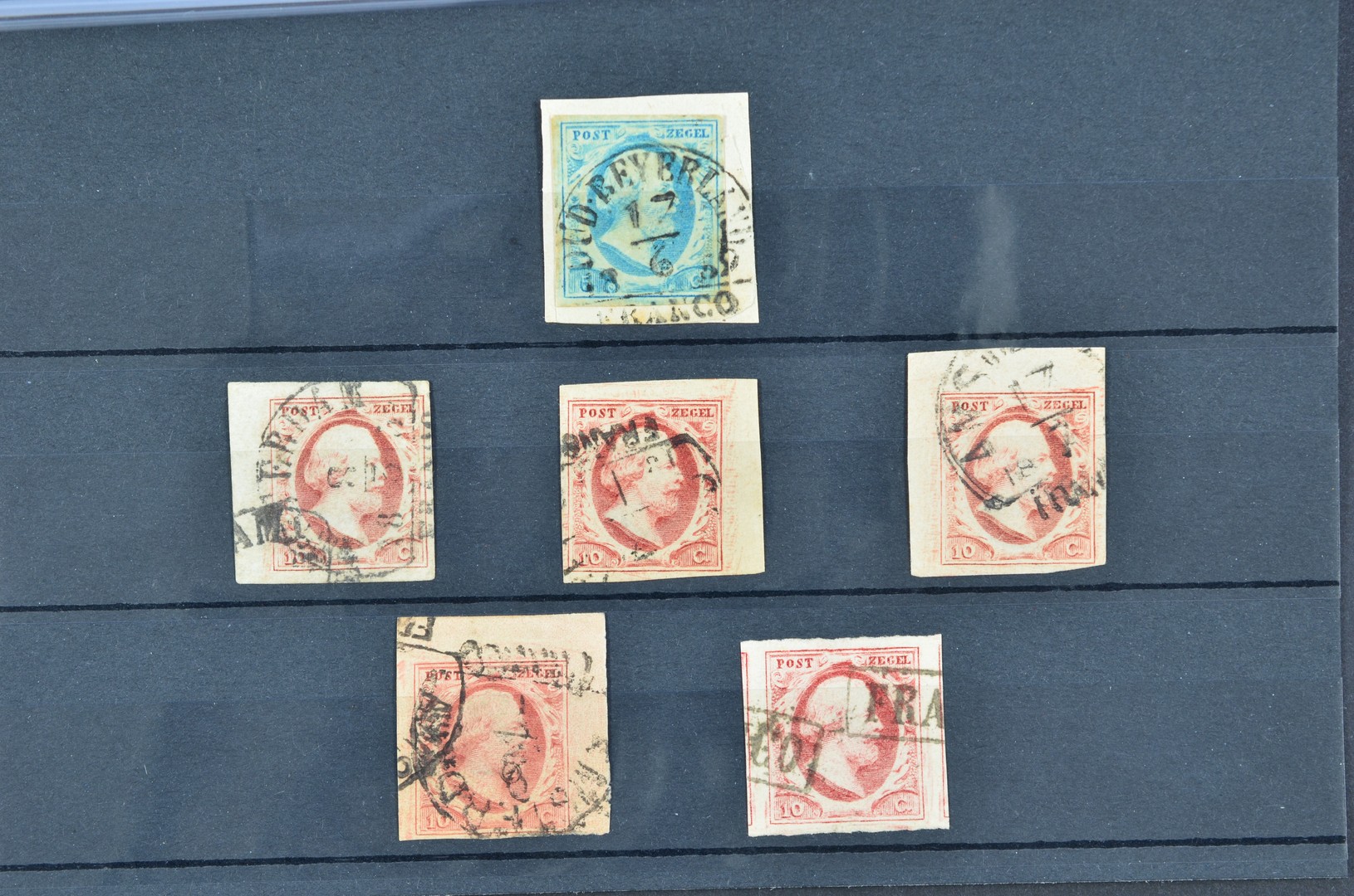 EMISSIE 1852, zeer breed gerande (hoek)stukken van 10 cent (plaat IV pos. 46, 65, 76, plaat V pos. 55 en plaat VIII pos. 64), alsmede Oud-Beyerland B (EY.200) op 5 cent