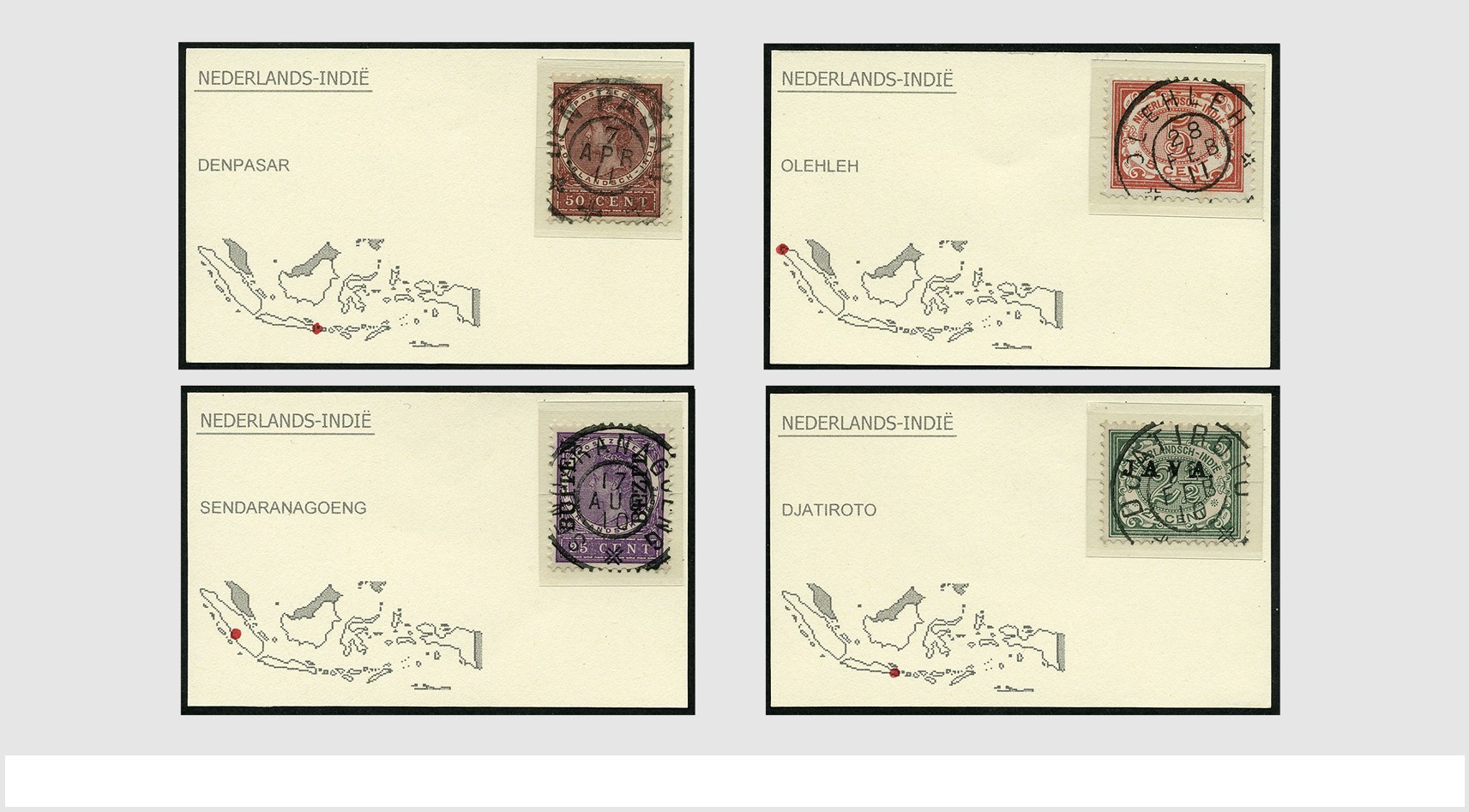 NED.- INDIË POSTHISTORIE. Verzameling grootrondstempels op losse zegels van diverse emissies en waarden, 59 verschillende stempels in uitgezochte kwaliteit w.o. schaarse en zeldzame kantoren als Brambanan, Den Pasar, Kabandjahe, Langsatoenong, Sendaranagoeng, Srandakan, Tasikmalaja, etc., op kaartjes met locatie, op alfabetische volgorde in bladen. Mooie start voor een grootrondcollectie van hoge kwaliteit!