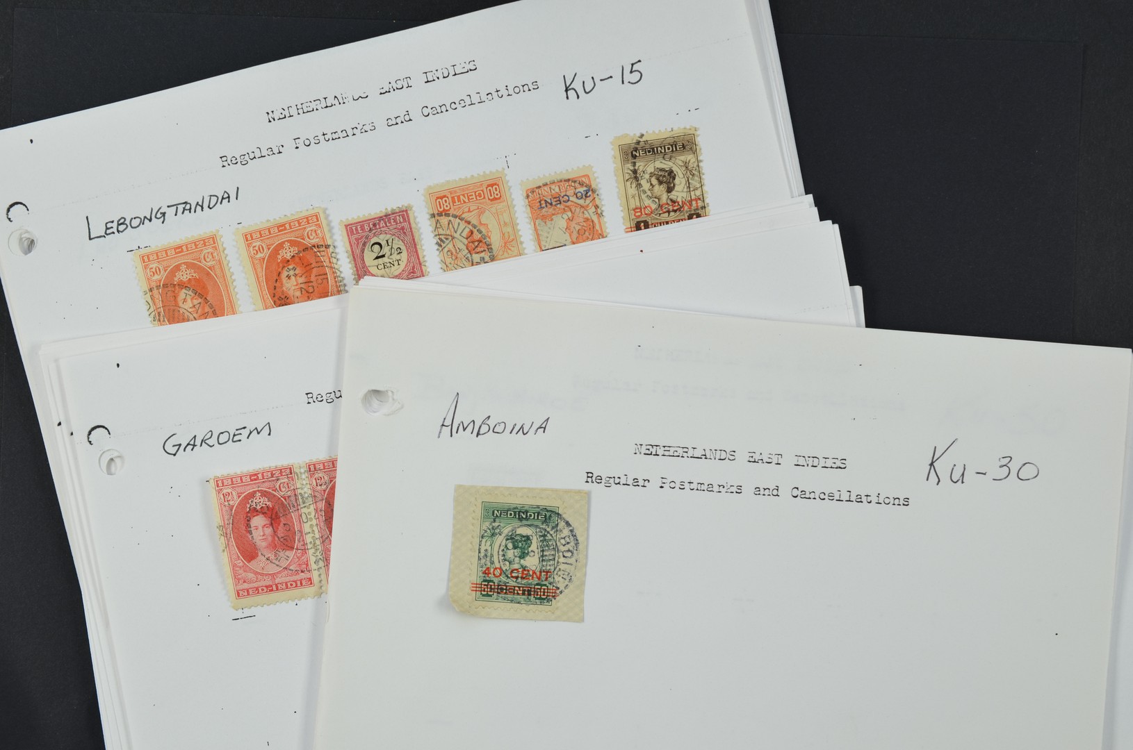 NED.- INDIË. Kortebalkstempels met uurkarakter (KBU), op bladen opgezette kleine verzameling op losse zegels, met wat betere kantoren als Larantoeka