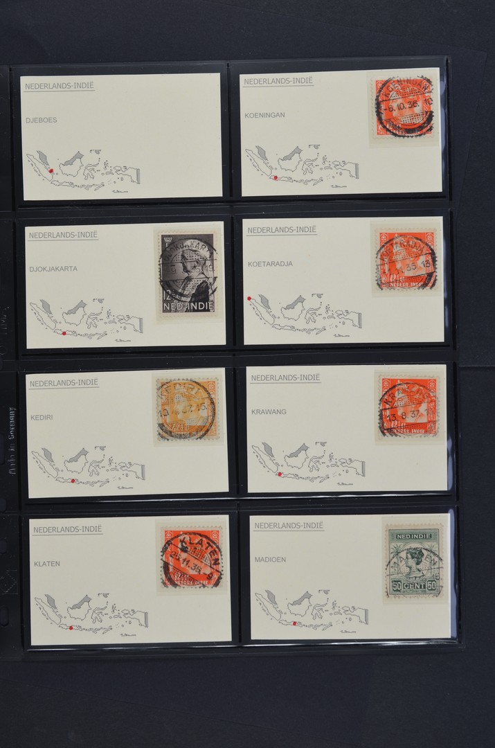 NED.- INDIË POSTHISTORIE. Verzameling puntvlakvullingstempels (typen PV1 en PV2) op losse zegels van diverse emissies en waarden, 56 verschillende stempels PV1 en 46 met type PV2, in uitgezochte kwaliteit w.o. schaarse kantoren als Koeningan (PV1, zegel miniem scheurtje), Manokwari (PV1 en PV2), Menes (PV1), Pandeglang (PV2), Poeloe-/Samboe, Sintang (PV1), etc. op kaartjes met locatie, op alfabetische volgorde in bladen