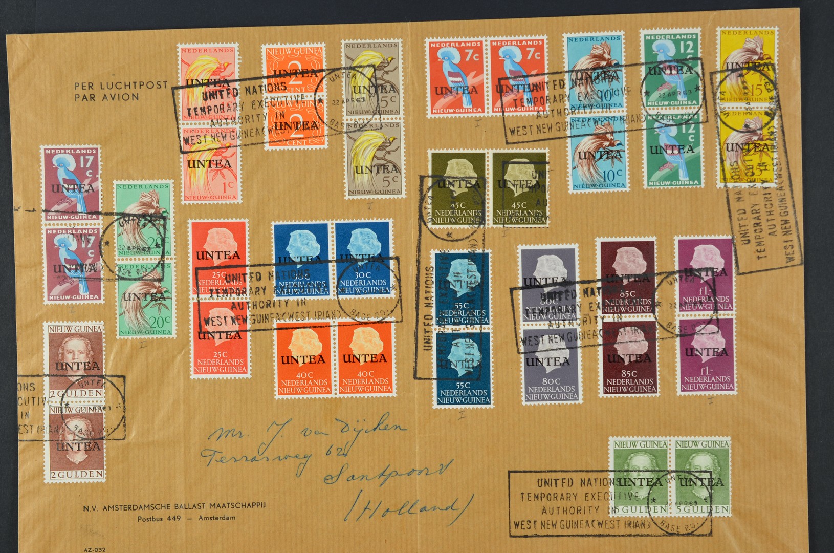 NED. NIEUW-GUINEA. Grootformaat luchtpostenvelop volgeplakt met UNTEA-zegels in paren, afgest. UNTEA Base P.O. alsmede Irian Barat drie adreskaarten uit 1965 (2x) en 1968 waarop Indonesische portzegels met opdruk