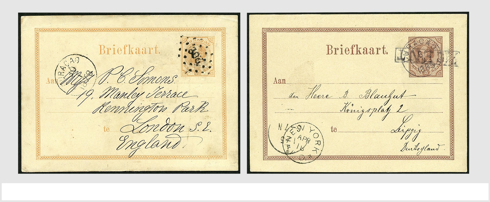 CURAÇAO, Posthistorie, 5 gelopen briefkaarten, waarbij 12½ cent-kaart 1877 (cert. Vleeming) en 4 kaarten 7½ cent opdruk waarvan 2 stuks kopstaand! Alle in frisse staat!