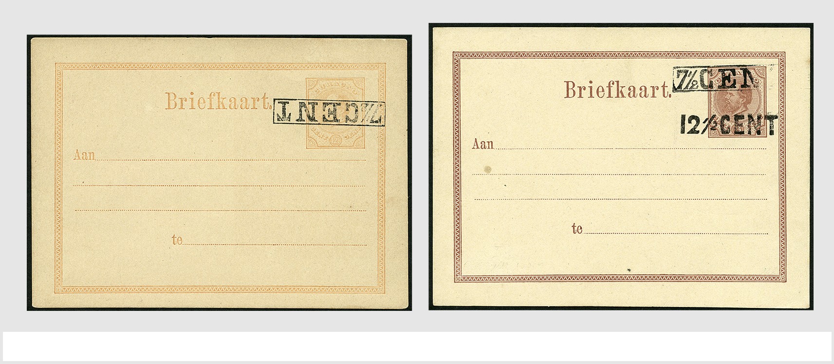 CURAÇAO, Posthistorie, 6 ongebruikte briefkaarten: 3x 7½ cent op 15 cent, waarbij 1x kopstaand en 1x proef, en 3x 7½ cent op 12½ cent, waarbij 1x kopstaand, 1x diagonaal en 1x verticaal. Zeldzaam materiaal!