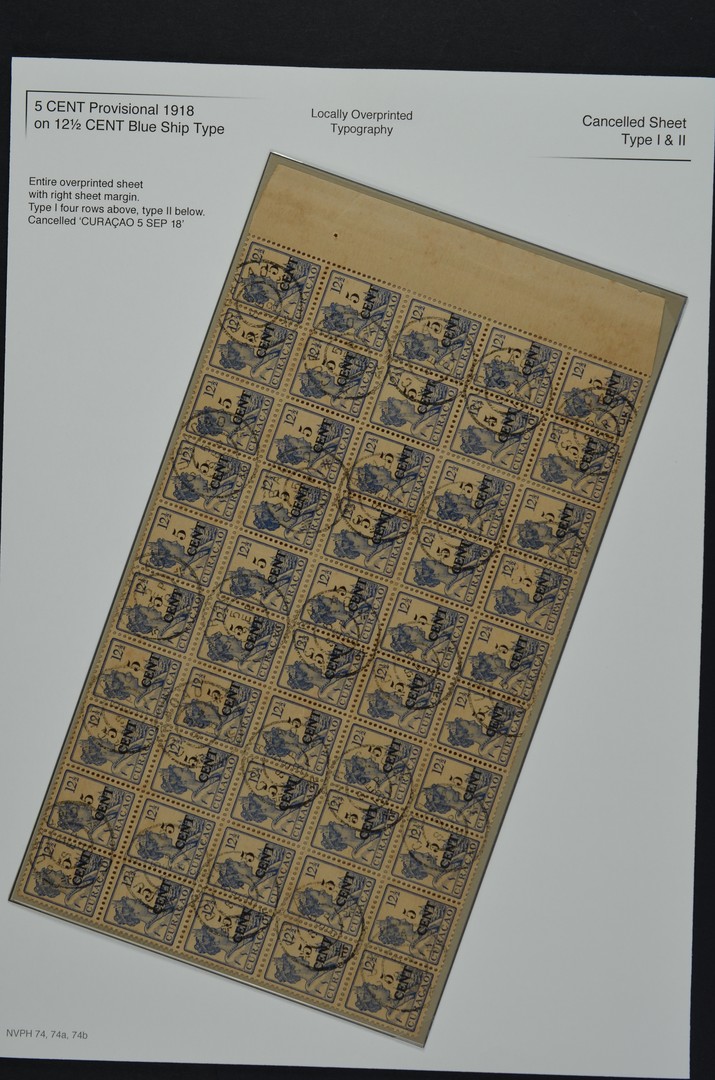 CURAÇAO, kleine verzameling op albumbladen van de nrs. 71 t/m 72a met div. stempels o.a. Saba, St.Eustatius, St.Martin en Bonaire, in totaal 52 stuks. Tevens 74/74a in veldelen van 45 en 50, getint, waarbij 19x 74a. Cat.wrd. ruim € 2100