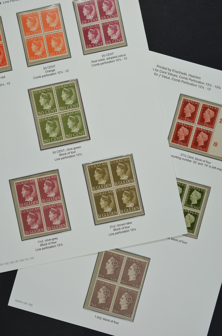 CURAÇAO, kleine verzameling meest postfrisse blokken van vier tussen 1929 en 1948 met o.a. 141/52 (geen 149), 185/95, tevens 182 met sterk verschoven opdruk in paar (getint) en blok van vier.