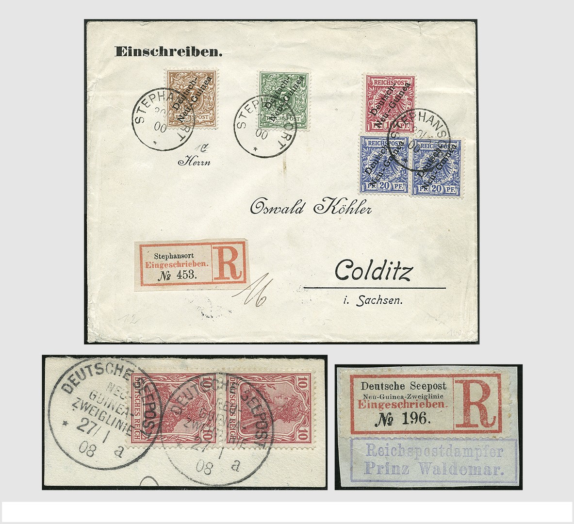 DUITS NIEUW-GUINEA. Bladen waarop 2 poststukken uit 1890 (naar Berlijn) en 1899 (naar Kaldenkirchen) met scheepspostafstempelingen van de 'Neu-/Guinea/Zweiglinie', tevens wat losse zegels, alsmede briefkaart van Simpsonhafen 1909 naar Hamburg en R-brief van Stephansort 1900 naar Colditz. Tevens set 'Mourining Stamps' voor alle verloren gegane Duitse koloniën