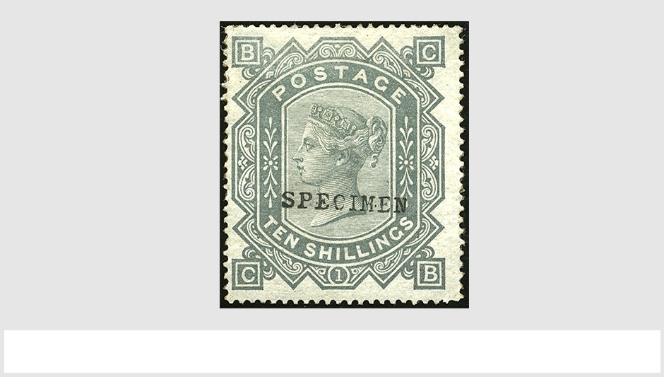 GREAT BRITAIN S.G. 128, 10 Shilling greenish grey, plate 1, C.B., with 'Specimen'-opt. fine unused with RPS- cert. (2016) toned, cv. £.4250.