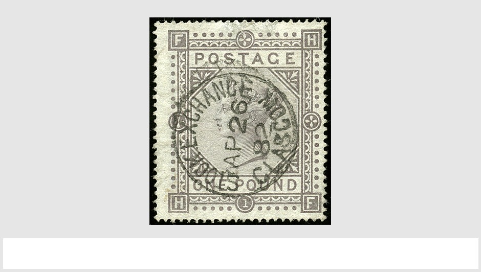 GREAT BRITAIN S.G. 129, 1 Pound brown-lilac, plate 1, HF, used with Superb "Glasgow-Stock-Exchange, RPS-Cert. (2016) cornercrease, repaired perf. at top and soiled, CV. £.4500.