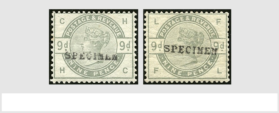 GREAT BRITAIN S.G. 195, 9 pence dullgreen, HC and FL, 2 copies with "Specimen"-opt., one with inverted wmk, both very fine unused with full original gum.