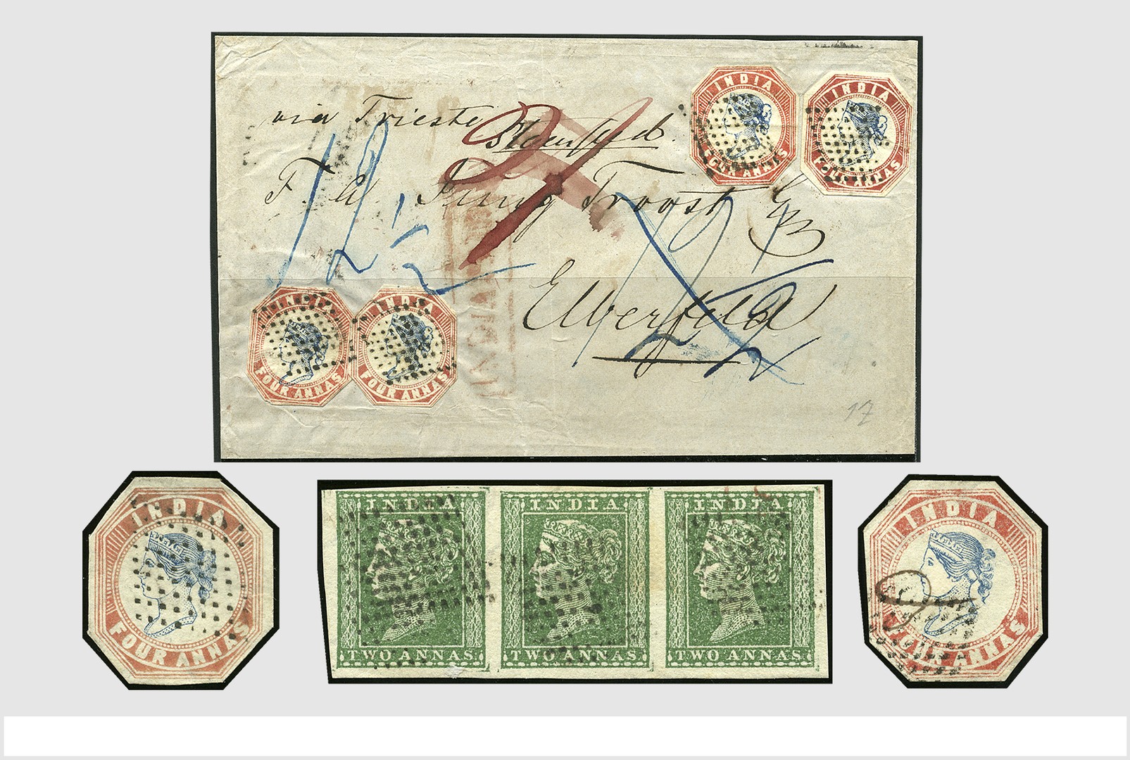 ENGELSE KOLONIËN, India en Ceylon op insteekbladen waarbij de 4 Annas blauw/rood 50x achthoekig gesneden, tevens S.G. 31 (16x) waarbij mooie strip van drie, Ceylon S.G. nrs. 6(2x) en 10